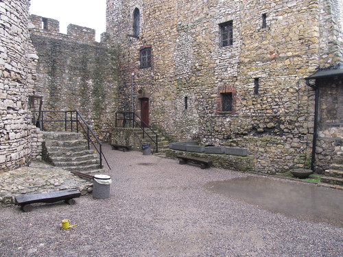 W przypadku, gdybyśmy ów ganek wysunęli nieco dalej, poza zewnętrzny mur obwodowy, moglibyśmy uzyskać tzw. gdanisko (średniowieczne WC). Mimo iż ciężko doszukać się na zamku pierwotnej toalety, takie rozwiązanie wydaje mi się mało prawdopodobne. Omawiając kwestię kasztelu-budynku mieszkalnego jeszcze na jedną rzecz należy zwrócić uwagę. Na przedłużeniu budynku w stronę północną, na poziomie I kondygnacji (czyli obecna piwnica poniżej dziedzińca) znajduje się jeszcze trzecie pomieszczenie, obecna karczma. Jest to miejsce chyba najbardziej tajemnicze na całym zamku górnym, ze względu na zniszczenia jakie w tym miejscu nastąpiły.