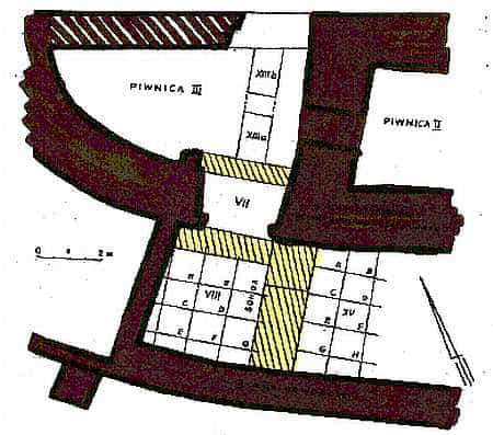 To samo co wyżej, ale w zbliżeniu: piwnica III to obecna karczma. Przerywaną linią zaznaczono mur późniejszy od pozostałych murów (obwodowych oraz budynku mieszkalnego.