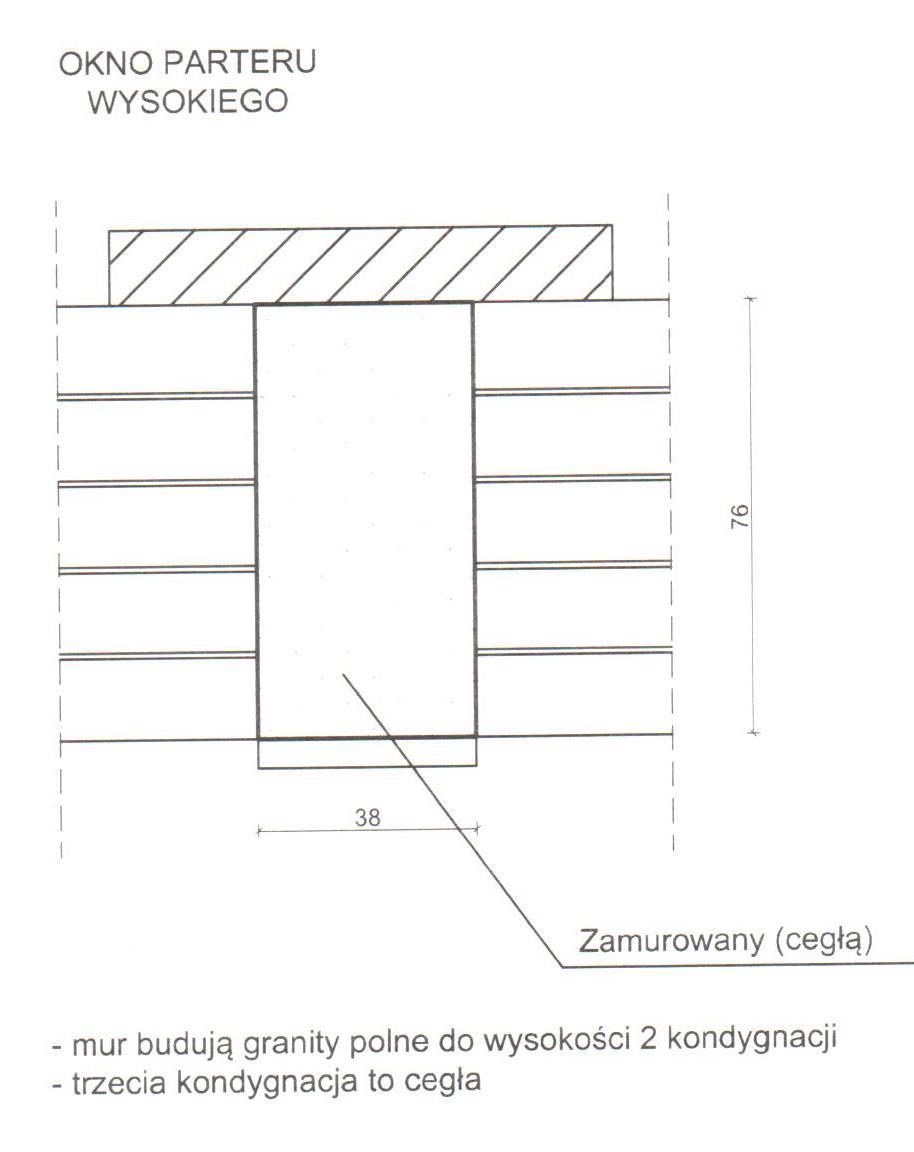 rysunek ideowy zamurowanego okna w drugiej kondygnacji dworu