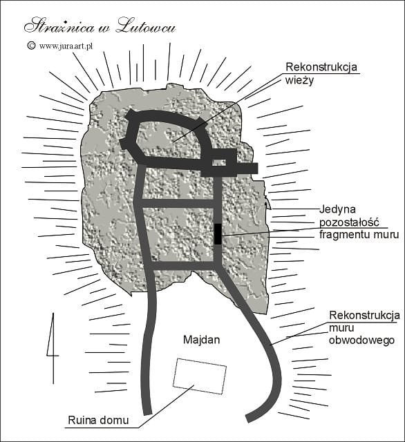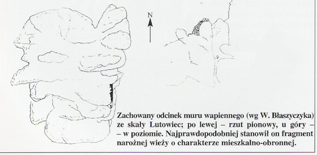 Podana długość zachowanego muru 4,5 metra jest trochę przesadzona, albo liczona razem z kawałkiem skały. Naocznie zaobserwowałem może z 2,5 metra, reszty niet. Łutowiec to ruiny dla mocno zaawansowanych. Niewiele widać, trafić niełatwo, do tego w części wsi nie ma asfaltu. Znalezienie skały zamkowej utrudnia to, że w pobliżu jest dużo podobnych wapiennych skałek. W "centrum" osady, przy widocznych oznaczeniach niebieskiego szlaku należy szukać posesji ogrodzonej starym drewnianym płotkiem. Za nią jest skała zamkowa. GPS N50.37'46.2 / E19.27'00.8. fot. stan z marca 2010
