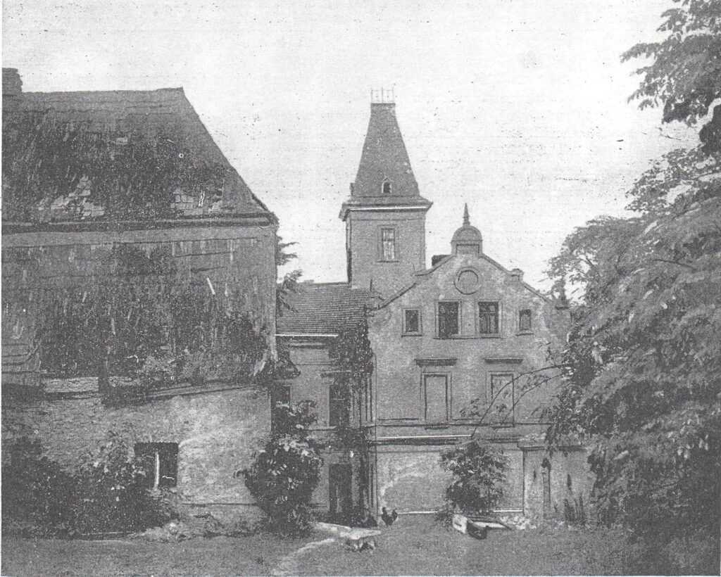 SIEROTY, Stary dwór z dachem mansardowym z lewej strony i nowy zamek wg fotografii opublikowanej w 1932 roku (za: GEISSLER 1932)