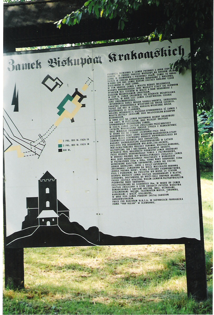 Zamek biskupów krakowskich datowany jest na drugą połowę XIII wieku. Usytuowany był na skłonie wzniesienia opadającego w kierunku Białej Przemszy. Miał za zadanie bronić dostępu do miasta od strony Krakowa. Jego kształt o wymiarach 124 x 90 m., o murach obronnych o grubości 2 - 3 m i wysokości 6 - 7 m, mógł konkurować jedynie z podobnymi, ówczesnymi zamkami książęcymi w Opolu i Wrocławiu. Jego mury wzmocnione były usytuowanymi centralnie na skrzydłach prostokątnymi półbasztami. Prawdopodobnie budowę zamku rozpoczęto przed rokiem 1283 z inicjatywy biskupa krakowskiego Pawła z Przemankowa. W 1283 prace zostały przerwane z powodu uwięzienia i odebrania własności biskupowi przez księcia Leszka Czarnego. W roku 1284 książę i biskup zawarli ugodę i dzięki odszkodowaniu, budowę zamku wznowiono. Jego wielkość i rozmach projektu została jednakże ograniczona przez Leszka Czarnego oraz przez ówczesne prawo dotyczące zakazu budowy zamków przez feudałów świeckich i duchownych. W miejscu półbaszty południowo-wschodniej na jego skrzydle wzniesiono wieżę mieszkalno-obronną, którą otoczono fosą i parkanem. W roku 1289 biskup sprzeciwił się i opowiedział się przeciwko Henrykowi IV Probusowi, który w zamian uwięził biskupa i w drodze na Kraków zajął zamek i oddał go pod opiekę Henrykowi z Woszowa. Wydarzenie to było jednocześnie pierwszą zachowaną wzmianką na temat zamku sławkowskiego. Następcą biskupa Pawła był Jan Muskata, który rozbudował zamek, otaczając go wałem ziemnym i fosą. W 1455 roku zamek został zniszczony przez nieopłacone zaciężne polsko-morawskie oddziały, walczące u boku Kazimierza Jagiellończyka przeciwko Krzyżakom. Zamek nie został już odbudowany.