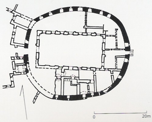 Po średniowiecznym założeniu pozostały mury obwodowe i resztki fosy. Zamek zbudowany był na planie owalu o średnicy 42 i 48m. Układ najstarszej zabudowy wewnątrz murów nie jest znany. Dotychczas odkryto jedynie pozostałości domu gotyckiego przylegającego do muru obwodowego oaz fragmenty wieży flankującej wjazd do zamku. W XVII i w XVIII wieku zamek przebudowano na barokową rezydencję. W I połowie XIX wieku przebudowano zamek na neogotycka rezydencję w stylu Tudorów. Obiekt został zniszczony przez pożar, następnie rozebrany.