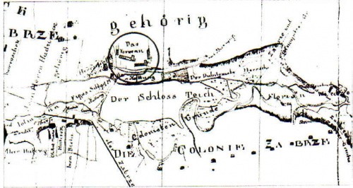 Fragment mapy Zabrza z 1790r. z zaznaczoną lokalizacją zamku