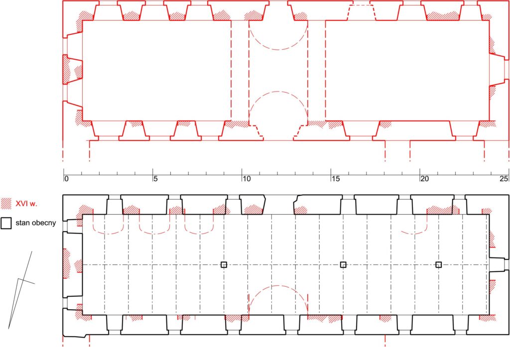 plan domu pańskiego – u góry wg stanu w XVI wieku, u dołu stan obecny z zaznaczonymi elementami pierwotnej struktury (ryc. M. CHOROWSKA, Katalog Zamków i Dworów Obronnych Śląska [ https://zamki.pwr.edu.pl/ ]. Licencja: CC BY-SA 4.0 [ https://creativecommons.org/licenses/by-nc/4.0/ ])