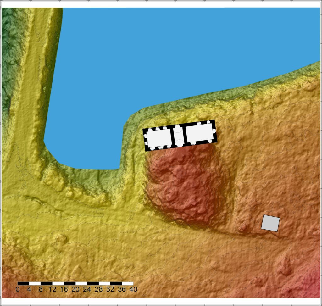 fragment mapy opracowanej z lotniczego skanowania laserowego z domem pańskim, kopcem na którym stał i przedzamczem (ryc. P. BŁONIEWSKI, Katalog Zamków i Dworów Obronnych Śląska [ https://zamki.pwr.edu.pl/ ]. Licencja: CC BY-SA 4.0 [ https://creativecommons.org/licenses/by-nc/4.0/ ])