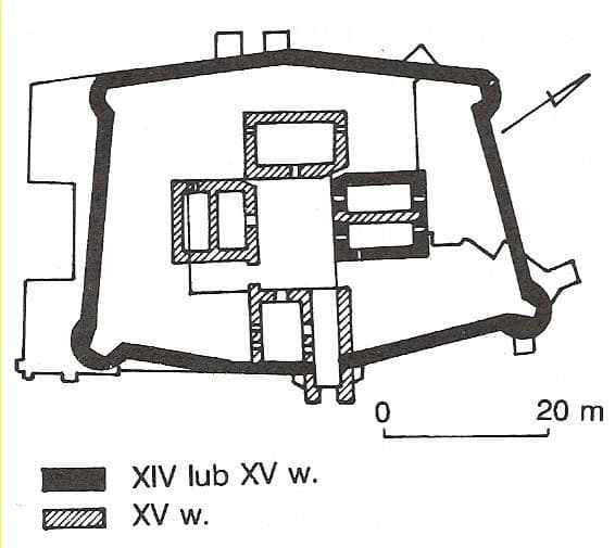 plan zamku z zaznaczonymi fragmentami najstarszego założenia wg. A.Swaryczewskiego