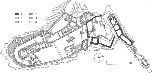 rozwarstwienie chronologiczne na planie zamku: 1-druga połowa XIII wieku, 2 - pierwsze 30-lecie XV wieku , 3-zamek pod koniec XV wieku, 4-pierwsza połowa XVI wieku, 5-1556-1616, 6-koniec XVIII wieku