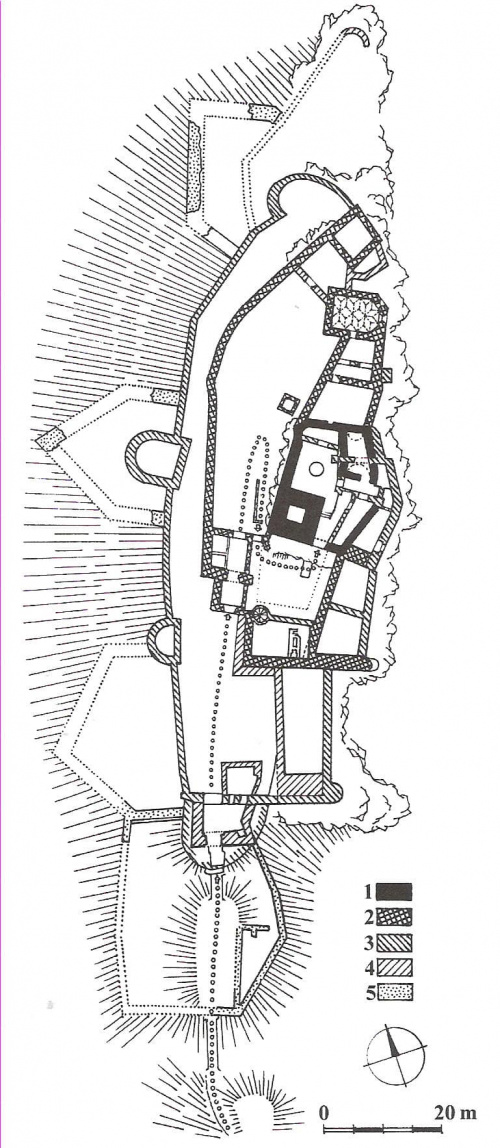 rozwarstwienie chronologiczne zamku: 1-przełom XIII/XIV wieku, 2- I połowa XV wieku, 3-koniec XV i początek XVI wieku, 4-XVI wiek i początek XVII, 5-połowa XVII wieku