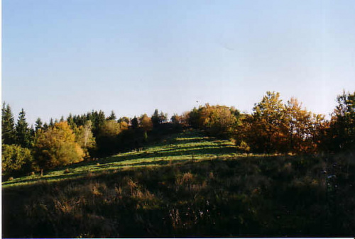 wyraźne podłużne wybrzuszenie terenu spod którego widać jakieś kamienne fundamenty, być może relikty muru zaznaczone na planie założenia poniżej