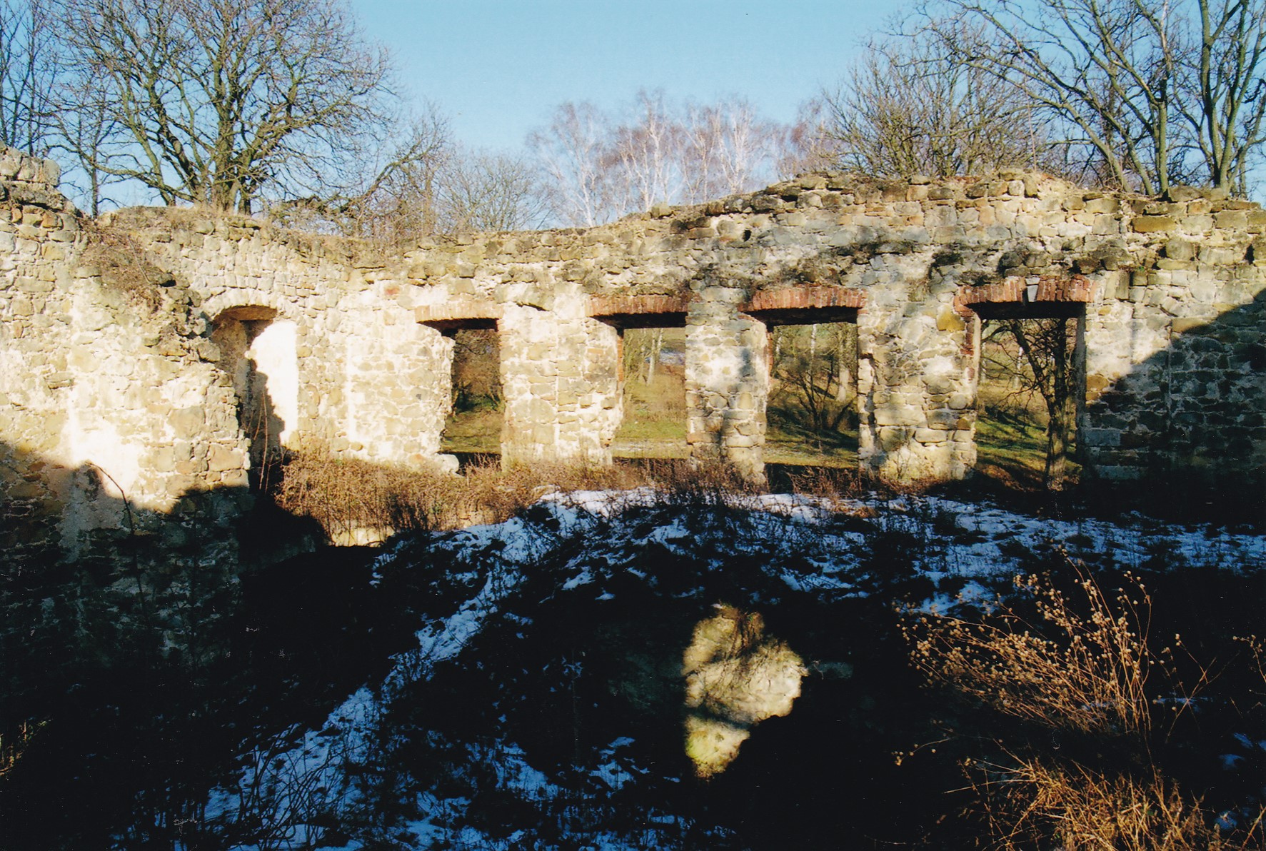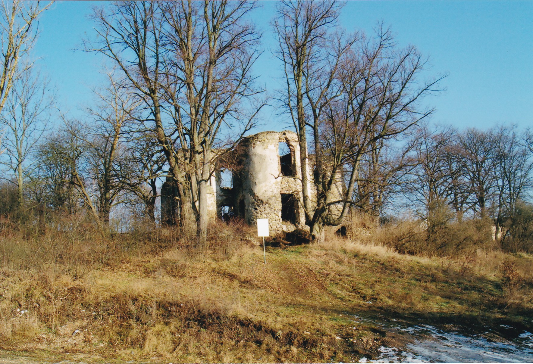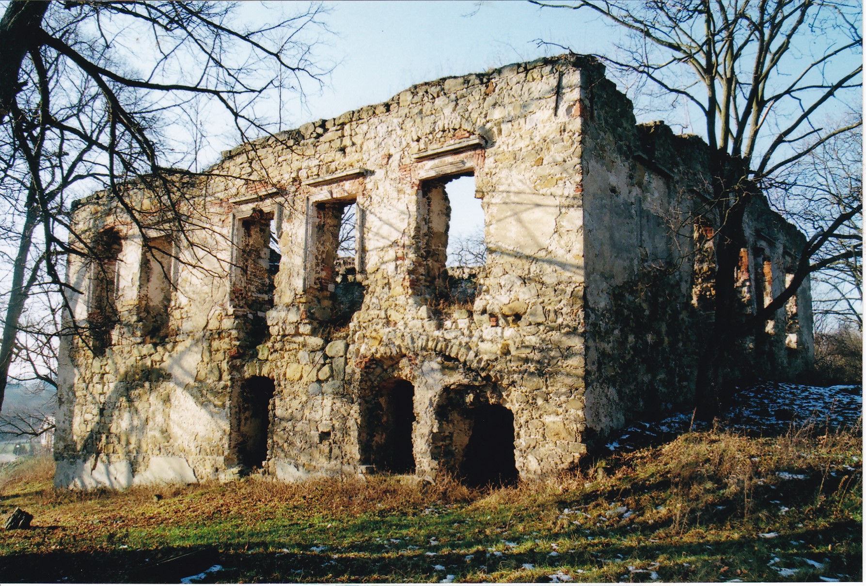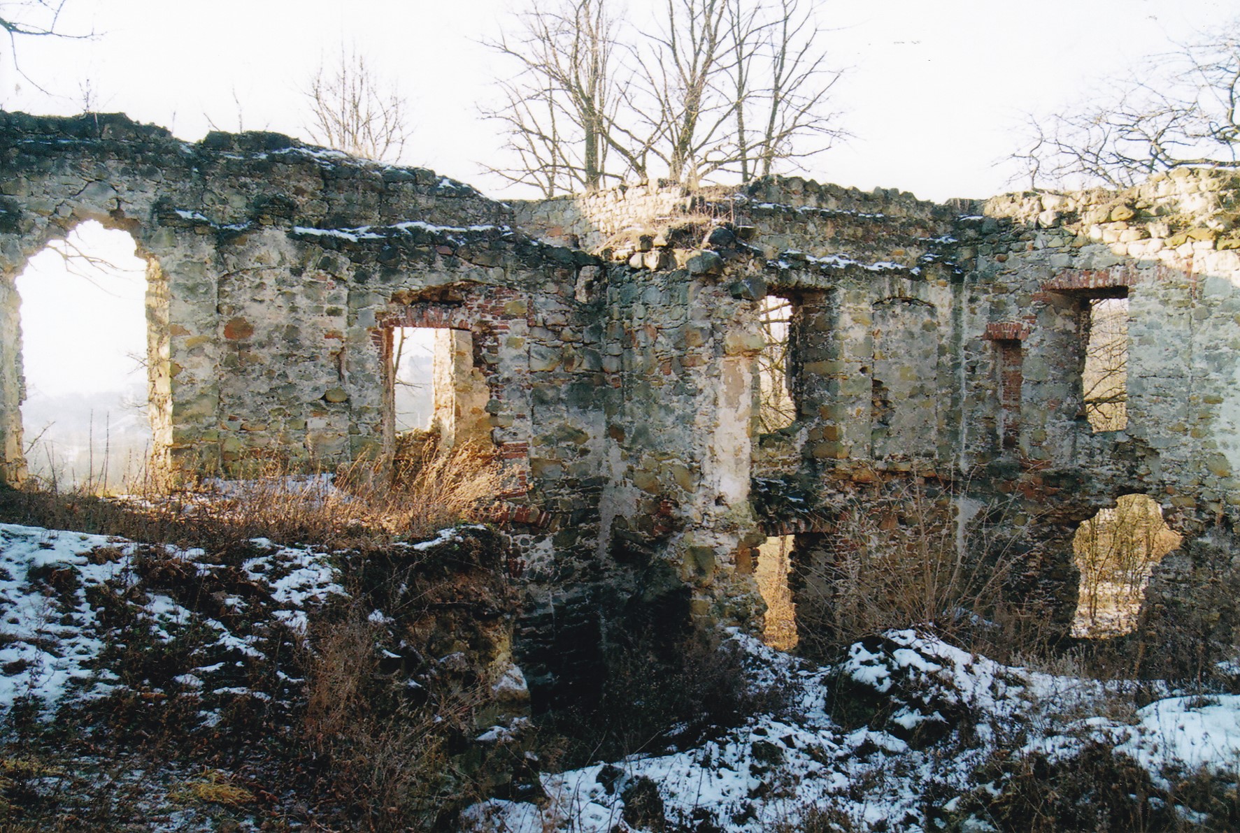 (...)kilkaset metrów od kościoła, naprzeciw nowej szkoły, znajdują się ruiny dworu. Jego historia jest ciągle pełna tajemnic. Prawdopodobnie zbudował go w końcu XVII wieku Stanisław Brzeski herbu Ciołek. Według innej wersji powstał z przebudowy średniowiecznego zamku. Był to okazały budynek - piętrowy z obszernymi sklepionymi kolebkowo piwnicami oraz kolistym ryzalitem od strony południowej. Krążyły opowieści, że piwnice połączone były podziemnym lochem z zamkiem w Chęciach, a arianie ukrywali tam skarby. Pierwotnie mógł mieć charakter obronny. Jeszcze przed wiekiem był zamieszkały, ale wskutek pożaru i ostrzału artylerii austriackiej został zniszczony. Do dziś przetrwały tylko fragmenty murów obwodowych dworu i częściowo zawalone piwnice. Większość otworów okiennych to bezkształtne dziury, pozbawione obramowań. Tylko na niektórych zachowały się resztki zdobień. Ruiny dworu otaczone są pozostałościami z dawnego parku, zarastają je drzewa, krzewy i chwasty.