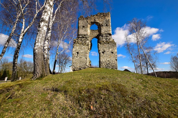Od siebie mogę dodać, że cały obiekt znajduje się na sztucznie usypanym wzniesieniu. Pierwotny budynek wieżowy faktycznie jest zbudowany z całkowicie innego materiału niż 3 pozostałe ramiona krzyża. W/g mnie na wzgórzu była pierwotnie sama wieża (stołp?), mająca już ze względu na swoje położenie walory obronne. |