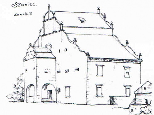 Dwór szaniecki został zbudowany najprawdopodobniej w latach 1580-1609 przez rodzinę Padniewskich. Renesansowy, ale wykorzystano przy nim elementy wcześniejszej budowli, gotyckiej. Według tradycji pełnić miał kiedyś funkcję zboru ariańskiego (jest to jednak wątpliwe). Około 1815 roku opustoszał, odtąd w ruinie.