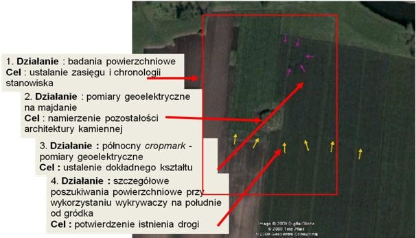 Wykorzystanie zdjęć satelitarnych pozwoliło nam zadać podstawowe pytania na temat zasięgu stanowisk i czasu potrzebnego do wykonania potrzebnych działań. W przypadku Czarnocina od razu stało się jasne, że jakiekolwiek działania będą bardzo utrudnione ze względu na zabudowę wsi i zadrzewienie. Badania w Krzczonowie zapowiadały się bardziej optymistycznie. Stanowisko znajduje się bowiem na polu ornym poza zasięgiem zabudowań i innych przeszkód. Na zdjęciach z Google Earth widoczne były dwa cropmarki a sam kształt nasypu (prostokątny zamiast owalny) wskazywał na intensywne zniszczenie jego formy terenowej przez działania rolnicze.
