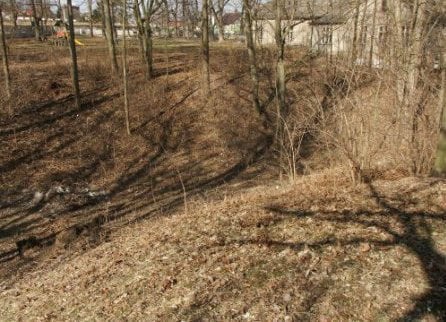 lokalizacja gródka na tle współczesnej zabudowy: 10-gródek, 9-dwór, 8-zespół kościoła parafialnego, 12-miejsce zwane Zamczysko, prawdopodobna lokalizacja dworu z XVII/XVIII wieku, 11-źródło "Strużyna", 14-cmentarz