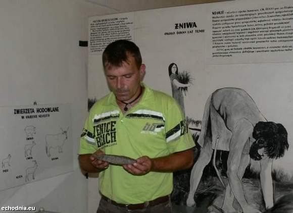 Archeolog Dariusz Greń prezentuje krzemienne siekiery sprzed 3,5 tysiąca lat, znalezione w okolicach Skowronna Dolnego. To znalezisko świadczy o znacznie starszym osadnictwie na tym terenie. (I. Imosa)