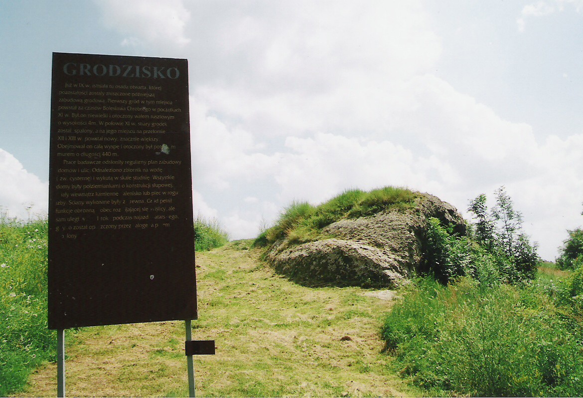 Gród wiślicki położony jest pośród łąk, około 500m na południowy wschód od wsi na wyniosłości gipsowej oblanej Nidą. Zarysem przypomina owalny trójkąt. Badanie archeologiczne wykazały ze najwcześniej, bo na przełomie IX i X w. istniała tu osada przekształcona później w gród. Pierwszy gród padł ofiara pożaru w XI wieku. Budowę nowego rozpoczęto najprawdopodobniej na przełomie XII i XIII wieku. Był on otoczony potężnym murem obronnym o długości 440m, wewnątrz znajdowało się 37 domów, zbiornik na wodę (cysterna) i studnia wykuta w skale. Gród został zniszczony około roku 1241 przez Tatarów i już nigdy nie został odbudowany. Do dziś zachowała się fosa biegnąca równolegle do wałów po ich zewnętrznej stronie.