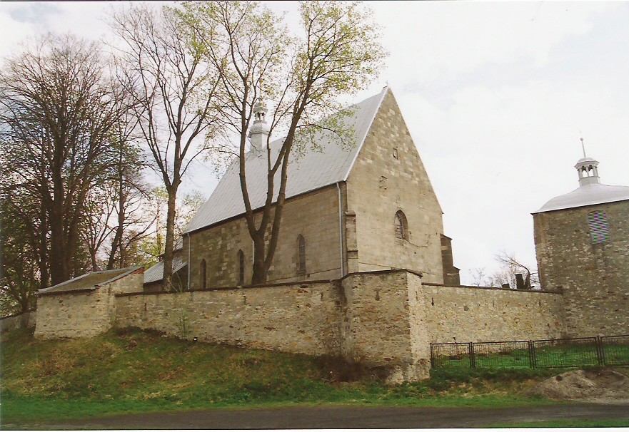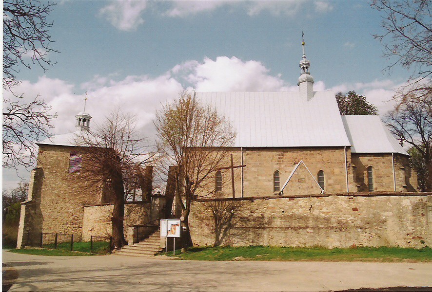 Gotycki kościół pw. Świętego Idziego Opata z przełomu XIV i XV wieku został wzniesiony w miejsce dawnego kościoła z XII w. Po pożarze z 1880 r., kościół został odbudowany i rozbudowany w latach 1906-1910 według projektu Józefa Dziekońskiego. Budowla orientowana ze szkarpami na zewnętrz. Świątynię przykrywa dwuspadowy dach. Na szczycie frontowej elewacji, od strony zachodniej, umieszczona jest kamienna tarcza z herbem Grzymała. Świątynia otoczona jest pochodzącym z XVI w. obronnym murem z basztami i strzelnicami. Z tego samego okresu pochodzi kościelna dzwonnica, która pełniła funkcję baszty bramnej. Na jej ścianach zachowały się fragmenty fryzu ozdobionego motywami roślinno-zwierzęcymi. Prezbiterium kościoła jest zamknięte wielobocznie i przykryte sklepieniem krzyżowo-żebrowym. W zakrystii znajduje się sklepienie kolebkowe. W czasie odbudowy do kościoła dobudowano neogotycką kruchtę.