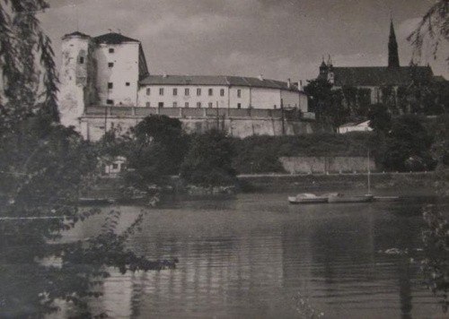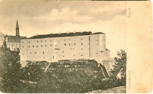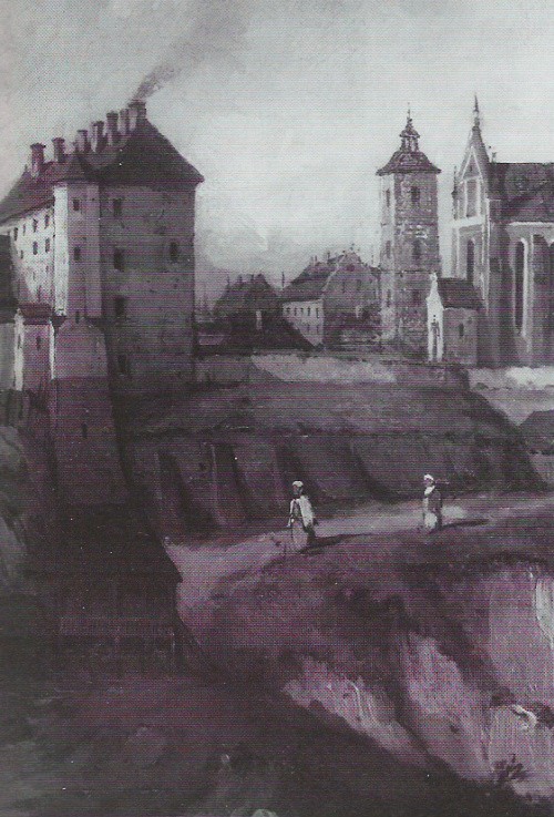 kolegiata i zamek od południowego zachodu w połowie XIX wieku na fragmencie obrazu J.Szermentowskiego