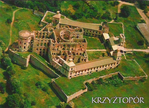 widok zamku z lotu ptaka na pocztówce wydanej przez Agencję JP