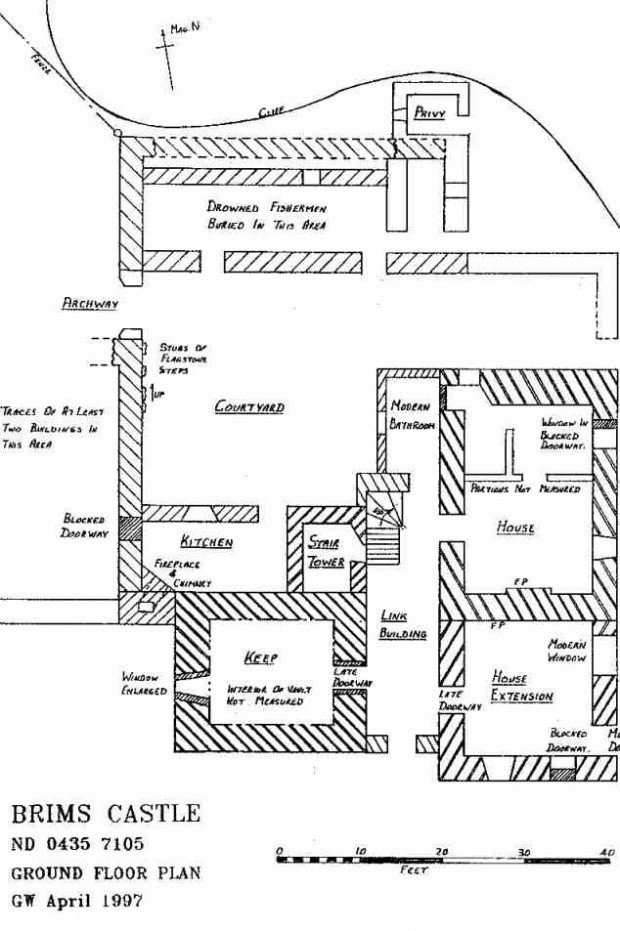 Znajdują się tu ruiny wieży mieszkalno-obronnej zwanej Brims Castle.