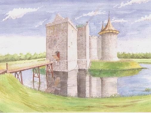 Niezwykły zamek wybudowany na planie koła z czterema bocznymi wieżami. Potężna wieża bramna została dodana w pierwszej połowie XVI wieku.