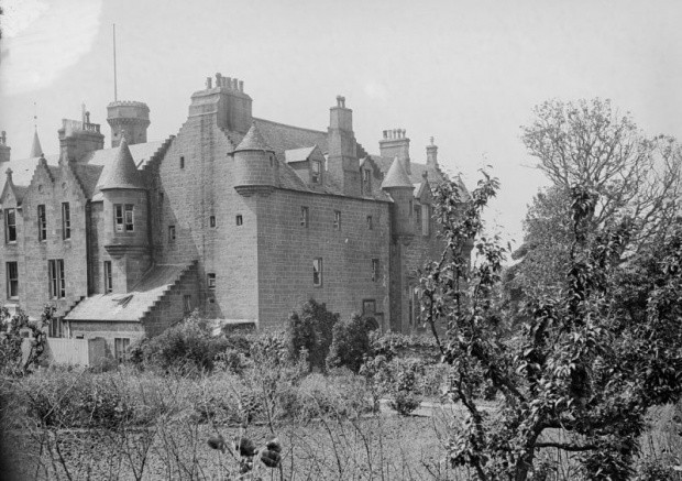 Tutaj wkradła się drobna nieścisłość. Oryginalny zamek, czyli prostokątna w planie wieża mieszkalno - obronna wciąż jak najbardziej istnieje. Tyle, że została nieco przebudowana. To nic innego jak ten biały budynek na ostatnim ze zdjęć. Zniszczeniu natomiast uległ, wykonany w szkockim stylu baronialnym (w roku 1852), dwór.