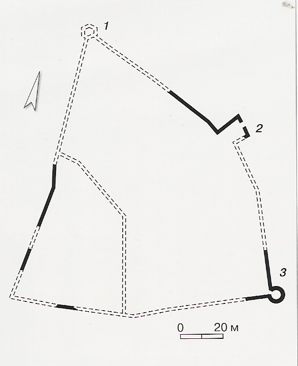 plan twierdzy: 1- Baszta Rohata, 2-Baszta Górna, 3-Baszta Dolna