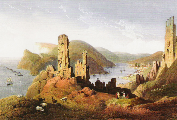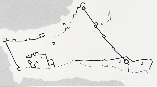 plan twierdzy: 1- zamek św. Jerzego, 2-zamek św. Mikołaja, 3-baszta Konsularna, 4- baszta średnia, 5-baszta Dolna