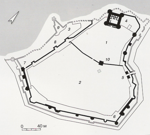 plan założenia: 1-Północne podzamcze, 2-południowe podzamcze, 3-podzamcze "portowe", 4-zamek, 5-Główna brama, 6-baszta Owidzka, 7-baszta Puszkina, 8-brama Owidiopolska, 9-barbakan, 10-wieża obserwacyjna