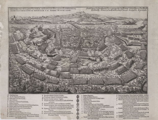 Bitwa pod Chocimiem 11 listopada 1673 na rycinie Johanna Bensheimera. Widoczny zamek.