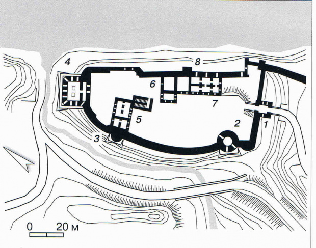 plan zamku: 1-wieża bramna, 2-południowo-zachodnia wieża, 3-baszta komendancka, 4-północna wieża, 5-dom komendanta, 6-kaplica, 7-koszary, 8-wschodnia wieża