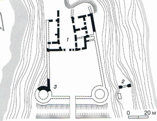 plan zamku: 1-pałac zamkowy, 2-brama, 3-wieża narożna