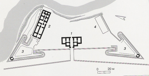 plan zamku: 1-brama, 2-pałac Lubomirskich, 3- bastion, 4-pałac Ostrogskich