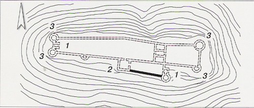 plan zamku, 1-2 bramy wjazdowe, 3-wieże
