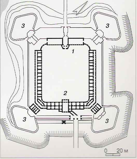 plan zamku, 1-wieża bramna, 2-pałac, 3-bastiony