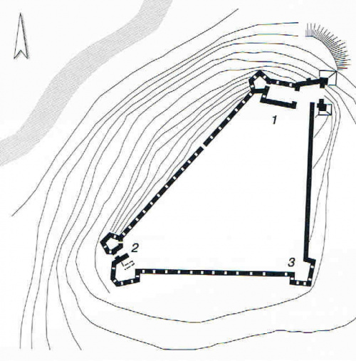 plan zamku: 1-północna wieża, 2-południo-wozachodnia wieża bramna, 3-wieża południowo-wschodnia