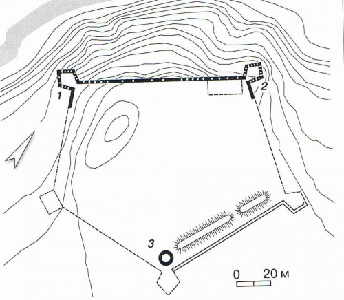 plan zamku: 1-wieża zachodnia, 2-wieża północna, 3-wschodnia wieża