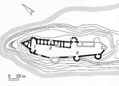 plan zamku: 1-północno-zachodnia część obronna, 2-pałac, 3-nadbramna baszta-basteja