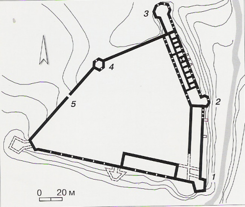 plan zamku: 1-baszta południowa, 2-baszta wschodnia, 3-baszta północna, 4-baszta północno-zachodnia, 5-brama