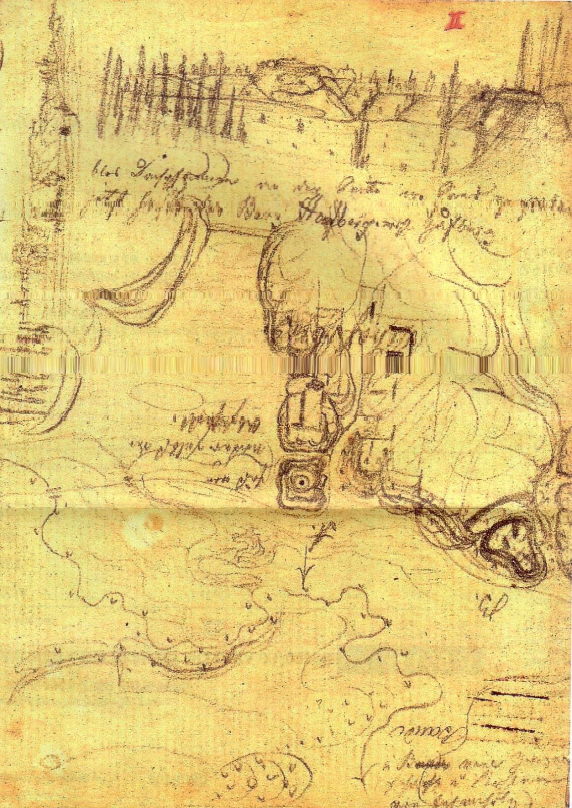 Bogdany, gm. Frombork (niem.Sonnenberg, Kr. Braunberg) – szkic J.Guise z lat 1826-1828. W górnej części widać panoramę grodziska od strony zachodniej, w centralnej części plan grodziska na tle okolicy, MVF: PM-IXh 00178a (Guise Zettel)
