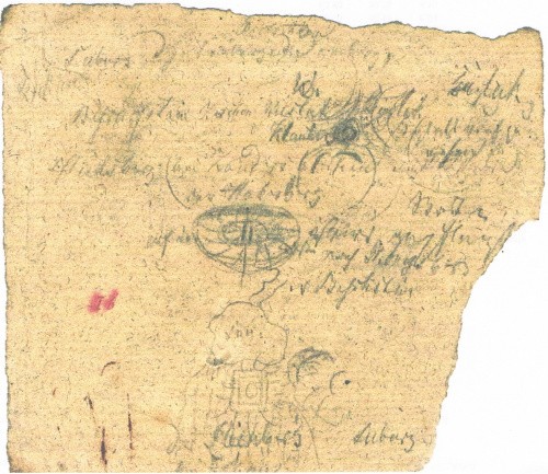 Tłokowo, gm. Jeziorany (niem. Lokau, Kr. Rößel) – szkic J. Guise z lat 1826-1828 położenia umocnienia zwanego Fliehberg w Tłokowie (w dolnej części ryciny) – MVF: PM-IXh 00101b (Guise Zettel)