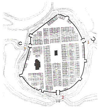 plan miasta z zaznaczonymi bramami: 1.Młyńska, 2.Lidzbarska,3.Królewiecka