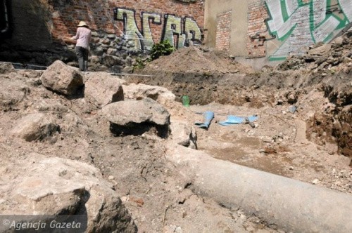 W rozległym wykopie, oprócz średniowiecznych umocnień, rzuca się w oczy relikt minionej epoki - wykonany w latach 80. kanał ciepłowniczy, który bezceremonialnie przebija średniowieczne mury miejskie. - W wielu miejscach cegły i kamienie zostały po prostu wycięte i wyrzucone - mówi archeolog - W tamtych czasach, gdy kładziono ciepłociąg, nikt się tym nie przejmował.