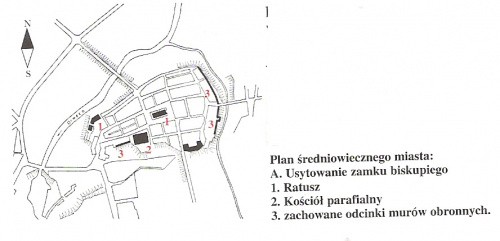 Początki miasta lokacyjnego to data 26 marca 1313 kiedy to następuje potwierdzenie praw miejskich, pojawia się także w dokumentach miejskich słowo "civitas". Mury miejskie zaczęto wznosić około 1341 roku. Na całej długości, posiadały 18 kwadratowych, 4 okrągłe i 3 półokrągłe baszty. Do miasta prowadziły 2 bramy, od wschodu Górna, zwana też Lidzbarską i Dolna zwaną Łazienną od zachodu. Bramy były wzmocnione wieżami z przejazdami. Poprzedzały je szyje bramne, a Bramę Górną poprzedzał jeszcze murowany most zakończony półcylindryczną basztą.