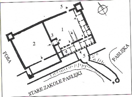 plan zamku wg Z.Nawrockiego: 1-zamek główny, 2-przedzamcze, 3-wieża bramna (zachowana), 4-dom mieszkalny, 5-bramy