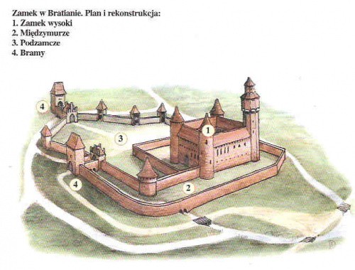 Zamek został wybudowany przez Krzyżaków w 1343 roku. Budowę zakończono w roku 1359. Składał się on z zamku niskiego, otoczonego murem obronnym z basztami oraz zamku wysokiego, zbudowanego w kształcie czworoboku, z dziedzińcem pośrodku i wieżami w narożnikach.2 lipca 1410 roku bratiański zamek gościł dostojników zakonnych, którzy odbyli ostatnią naradę przed wielką bitwą stoczoną na polach Grunwaldu. Po bitwie grunwaldzkiej zamek na krótko przechodzi w ręce polskie, a jego zarządcą zostaje polski rycerz Jan Kretkowski. Pierwszy pokój toruński zawarty w 1411 r. przyznaje zamek ponownie Krzyżakom i dopiero po roku 1466 (II pokój toruński) zamek ponownie staje się siedzibą starostów polskich. Z czasem zamek popada w ruinę i zostaje rozebrany. Cegła zostaje użyta do przebudowy klasztoru i kościoła franciszkanów reformatów w Łąkach. Obecnie na fundamentach zamku znajduje się młyn wybudowany na początku XX wieku. W okolicy młyna jest kilka zachowanych murowanych zamkowych fundamentów.