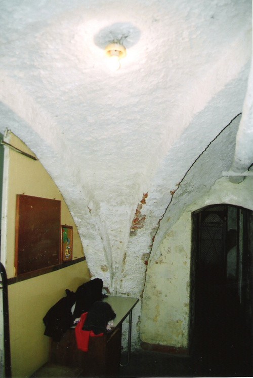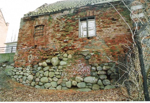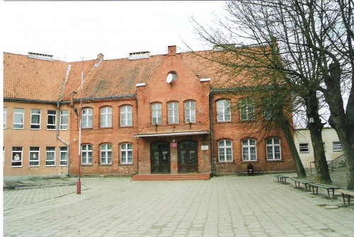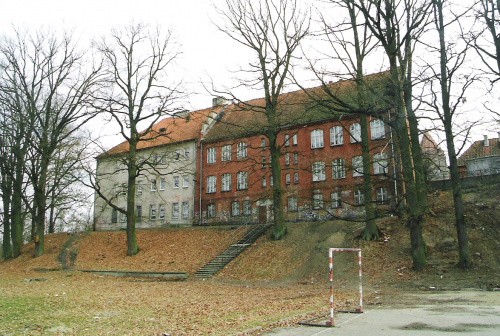Na zdjęciach szkoła w miejscu zamku, zachowane, widoczne fragmentarycznie jego relikty, oraz zachowane gotyckie, zamkowe piwnice