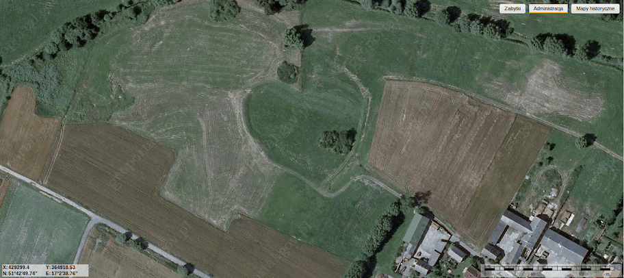 W kilku miejscach ślady po wałach? Rozrzucone są po całej powierzchni widocznej na zdjęciu satelitarnym, zdecydowanie zbyt dużej powierzchni jak na grodzisko, zatem część to na pewno efekty rozwożenia po polach.