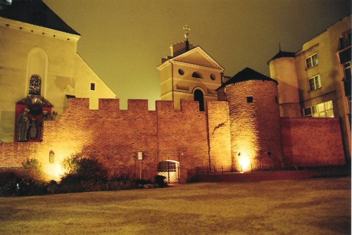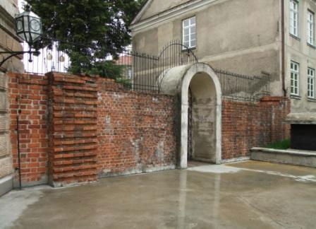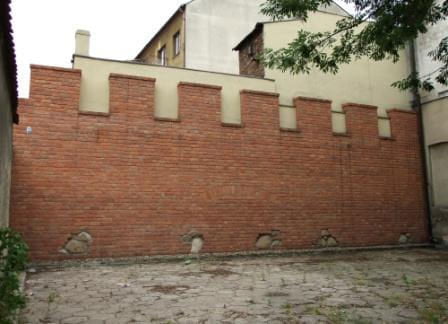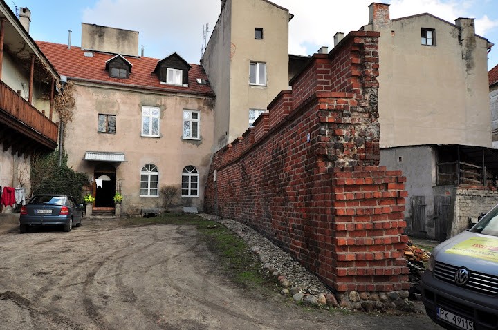 6. Ulica Kazimierzowska. Do południowej nawy kościoła franciszkanów przylega najmniej znany, 7-metrowy fragment muru obronnego.